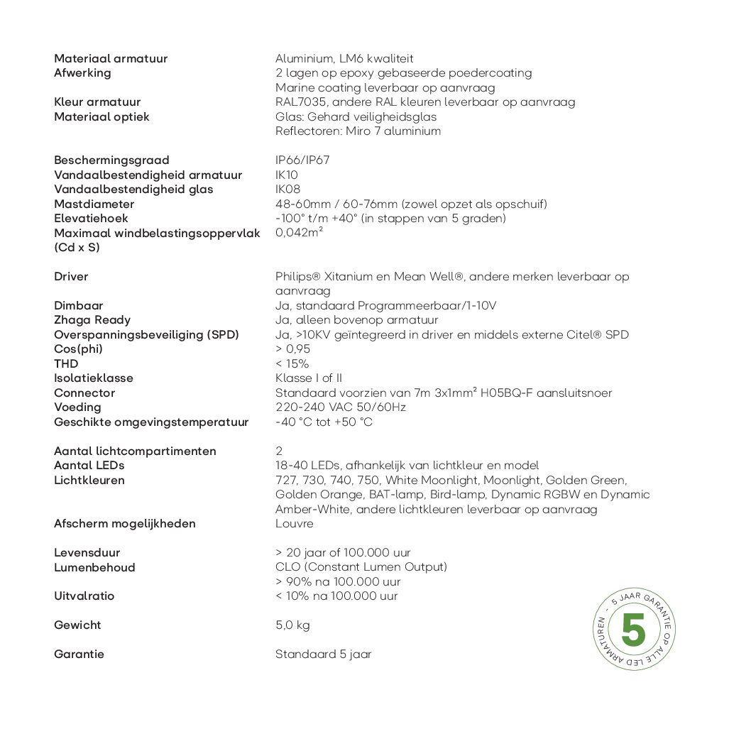Technisch is de Mini Nicole toekomstbestendig: het armatuur is Zhaga-ready en kan worden uitgerust met een Zhaga-connector aan de bovenkant. Met een hoge kwaliteit en ENEC-certificering is de Mini Nicole een betrouwbare keuze voor duurzame en efficiënte straatverlichting.