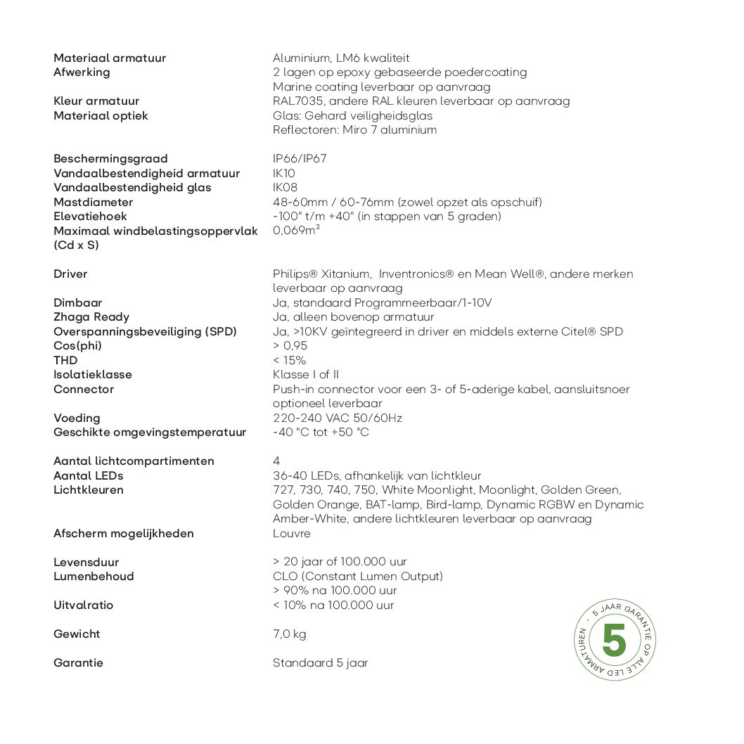 Technisch is de Nicole toekomstbestendig: het armatuur is Zhaga-ready, voorzien van een D4i-driver en uitgerust met een Zhaga-connector aan de bovenkant. Met een hoge kwaliteit en ENEC-certificering is de Nicole een betrouwbare keuze voor duurzame en efficiënte straatverlichting.